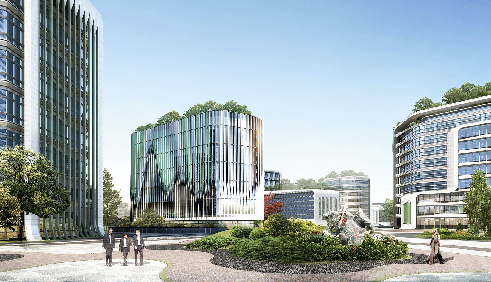 規(guī)劃設(shè)計(jì)以“曲水流觴”為理念,空間布局取“曲水流觴”場(chǎng)景精髓,以曲徑通幽的景觀系統(tǒng)作為主軸,以組團(tuán)布局的院士樓為節(jié)點(diǎn),完成整個(gè)園區(qū)的規(guī)劃設(shè)計(jì)。布局貫穿南北的云游步道,曲徑通幽,步移景異,人在步道上行走,猶如流動(dòng)的羽觴杯,尋訪院士樓、穿行重重竹林、覓河濱綠地等景致,體會(huì)古代曲水流觴之儒風(fēng)雅俗。