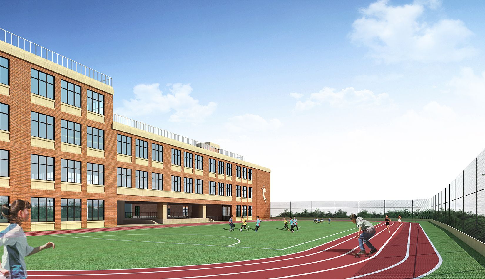 該項(xiàng)目的設(shè)計(jì)延續(xù)區(qū)域肌理,與區(qū)域城市肌理相融合,提高區(qū)域環(huán)境。立面設(shè)計(jì)考慮市南區(qū)及鎮(zhèn)江路原有學(xué)校風(fēng)格,采用學(xué)院派建筑風(fēng)格,塑造古典人文氛圍,校園墻體通過磚的變化設(shè)計(jì)文化墻,將文化傳承與精神傳承融合在建筑之中。根據(jù)地勢和日照進(jìn)行功能布局排列,下沉庭院、連廊和架空設(shè)計(jì)的鄰近操場的校園環(huán)境設(shè)計(jì),一方面塑造了豐富多彩的校園環(huán)境,另一方面充分保證了室內(nèi)環(huán)境的采光,讓孩子們更多地享受陽光。