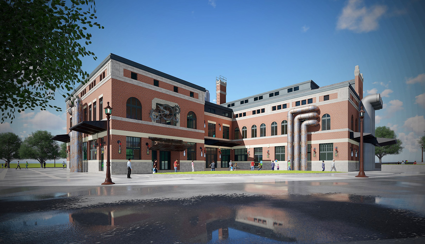 紅磚是工業(yè)風(fēng)的最佳表現(xiàn)元素之一,本案選取紅磚作為立面主要材質(zhì),加以真石漆、石材進(jìn)行點(diǎn)綴,磚塊與磚塊中的縫隙可以呈現(xiàn)有別于一般墻面的光影層次。屋面形式選取深灰色瓦屋面加以深色金屬板點(diǎn)綴,與立面形成強(qiáng)烈的視覺對(duì)比,旨在體現(xiàn)工業(yè)風(fēng)的粗獷氛圍。