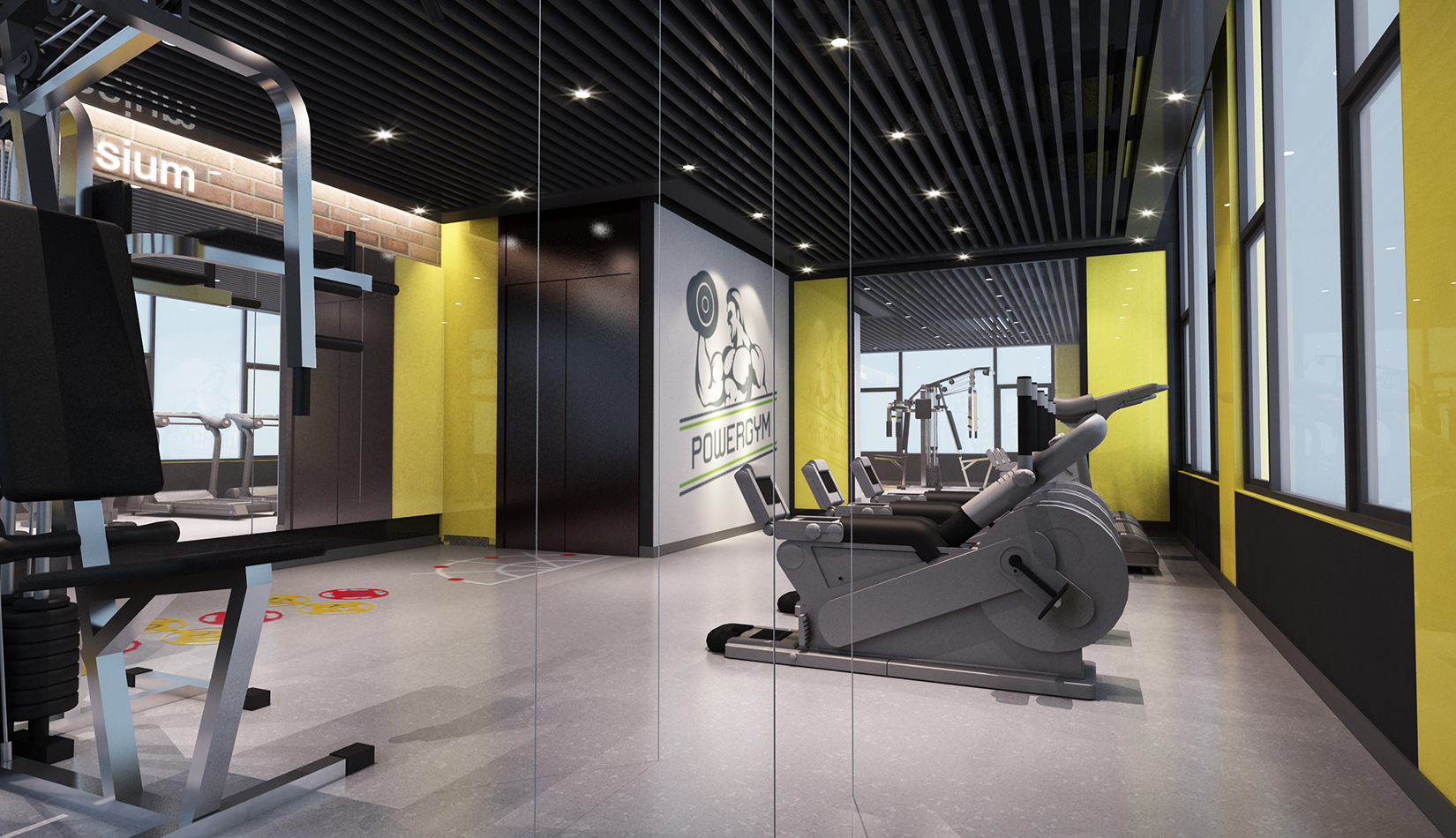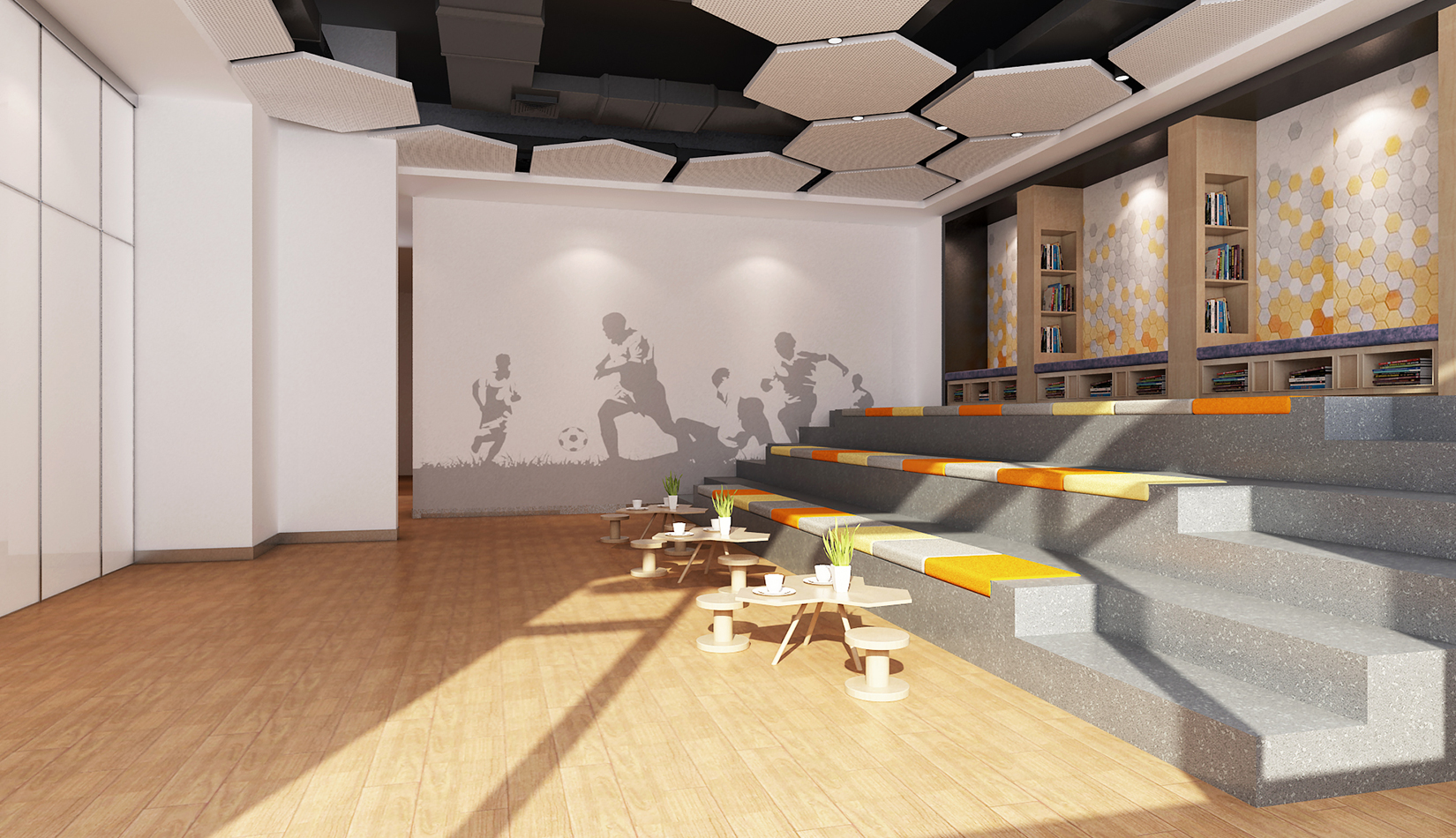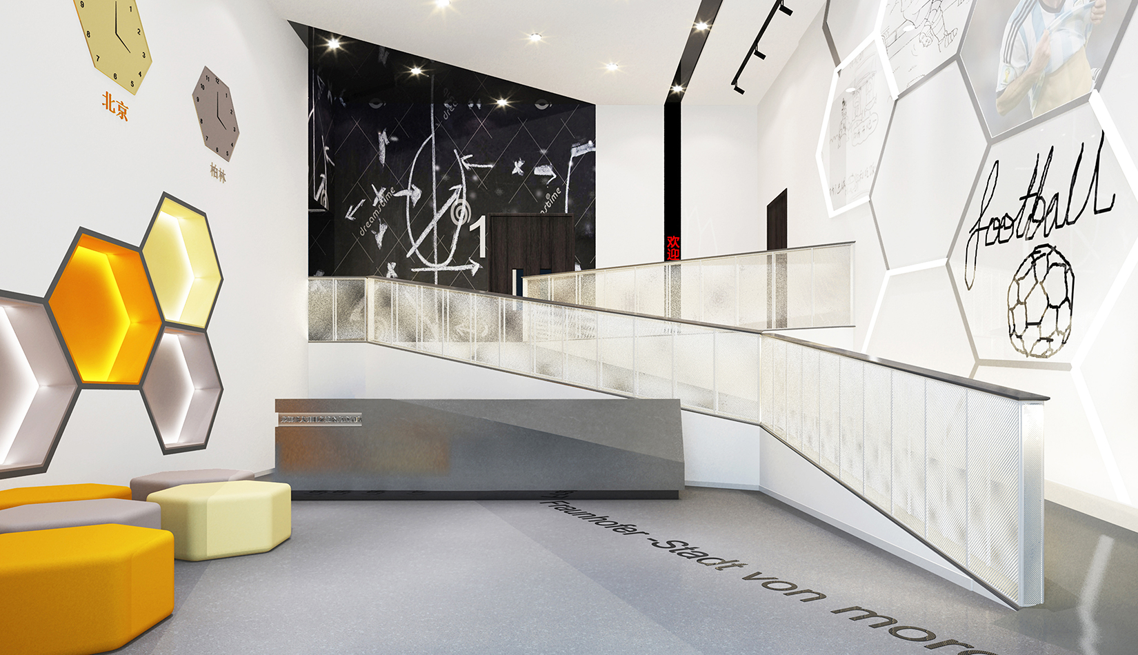 一層大廳提取足球六邊形元素作為墻面背景,在此設(shè)計(jì)人行坡道,方便人流同行,并能形成較好的形式感。