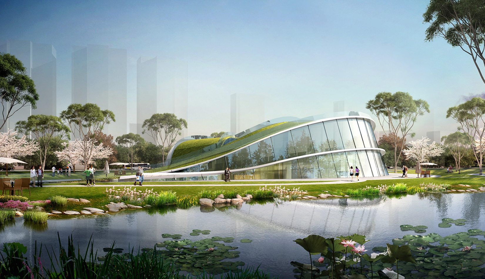 該項(xiàng)目基地位于濱河公園內(nèi),目標(biāo)要將博物館打造成一個(gè)生態(tài)建筑,建筑能與環(huán)境有機(jī)融合。在這一理念下,將博物館設(shè)計(jì)為樹(shù)葉形,建筑猶如一片樹(shù)葉飄落在公園內(nèi),以此體現(xiàn)建筑與環(huán)境的融合。將樹(shù)葉形建筑設(shè)計(jì)為覆土建筑,最大程度還原基地一片綠色,以此呼應(yīng)李村大集的“還原”內(nèi)涵。通過(guò)設(shè)計(jì)兩個(gè)曲線形體相互交融形成建筑的最終體量,以此體現(xiàn)相逢意蘊(yùn),呼應(yīng)李村大集的“相逢”內(nèi)涵。